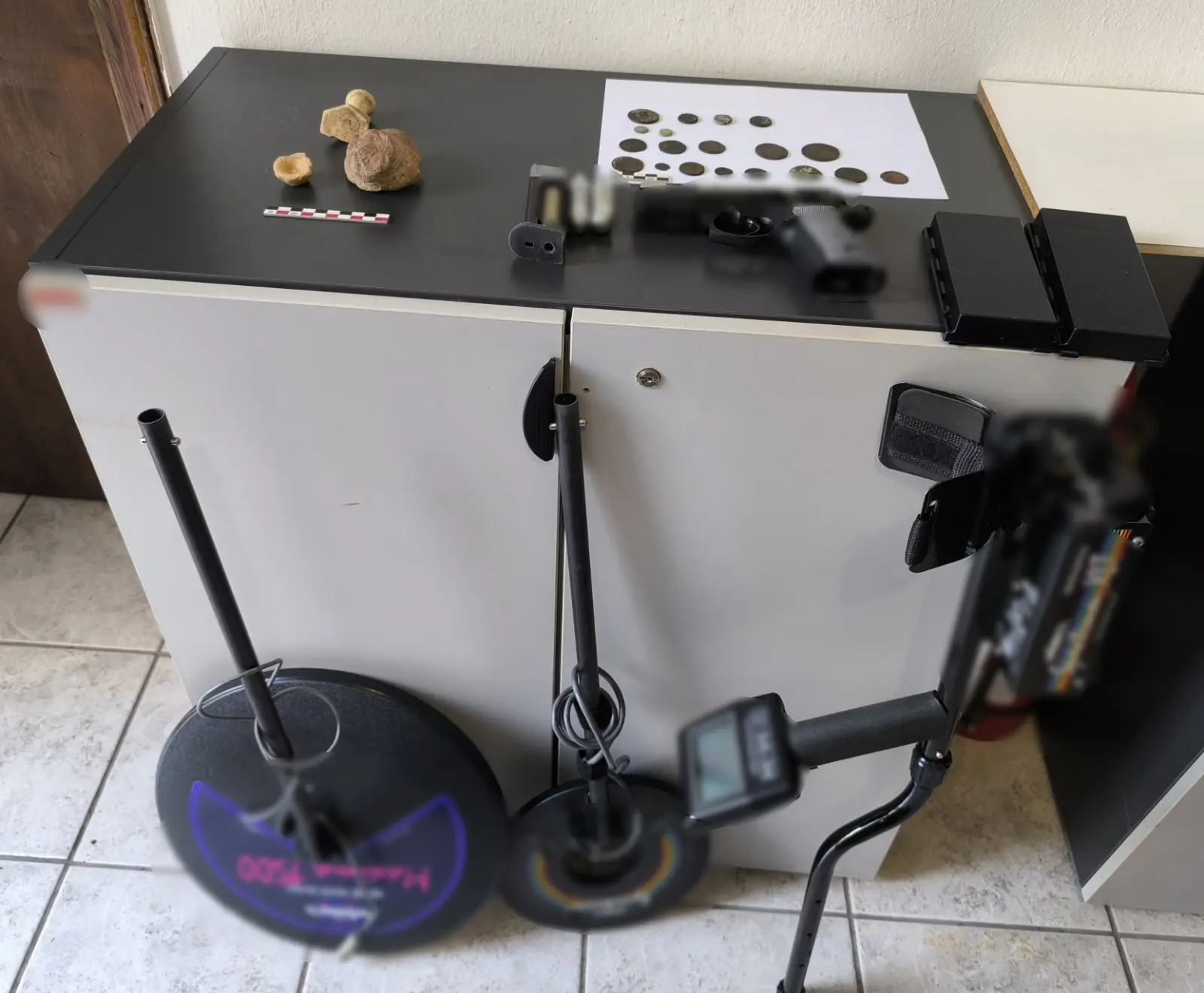 Κατασχέθηκαν, μεταξύ άλλων,  20 νομίσματα,   3 όστρακα μινωικής εποχής, αεροβόλο πιστόλι με γεμιστήρα και  3  αμπούλες αερίου, ανιχνευτής μετάλλων,  2  μπαταρίες, 2  δίσκοι και τσάντα μεταφοράς