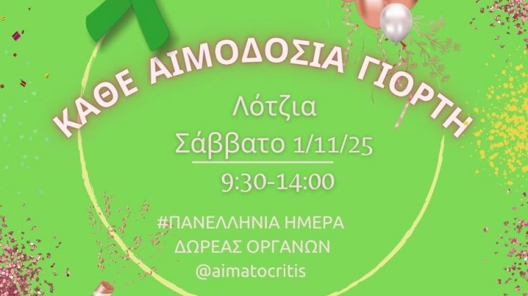 Το Σάββατο 1 Νοεμβρίου 2025 θα πραγματοποιηθεί εθελοντική αιμοδοσία στο κέντρο της πόλης του Ηρακλείου και συγκεκριμένα στο αίθριο της Λότζια από τις 09:30 έως τις 14:00. Παράλληλα με την εθελοντική αιμοδοσία και με αφορμή την Πανελλήνια Ημέρα Δωρητών Οργάνων θα υπάρχει ενημερωτικό περίπτερο για την δωρεά οργάνων με ενημερωτικό υλικό για οποίον επιθυμεί να λάβει περισσότερες πληροφορίες.