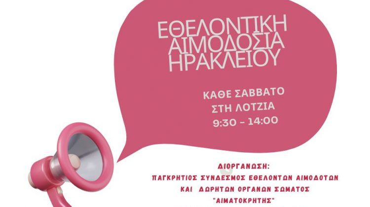 Σήμερα Σάββατο 28 Μαρτίου 2026 θα πραγματοποιηθεί εθελοντική αιμοδοσία στο κέντρο της πόλης του Ηρακλείου και συγκεκριμένα στο αίθριο της Λότζια από τις 09:30 έως τις 14:00. Η εθελοντική αιμοδοσία πραγματοποιείται κάθε Σάββατο.