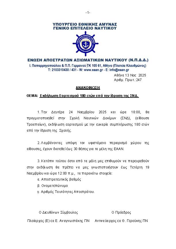 Εκδήλωση Εορτασμού 180 ετών από την ίδρυση της ΣΝΔ Νοέ 19, 2025 Share on FacebookPost on XFollow usSave
