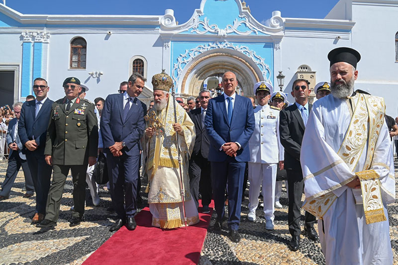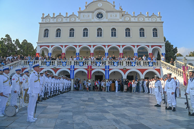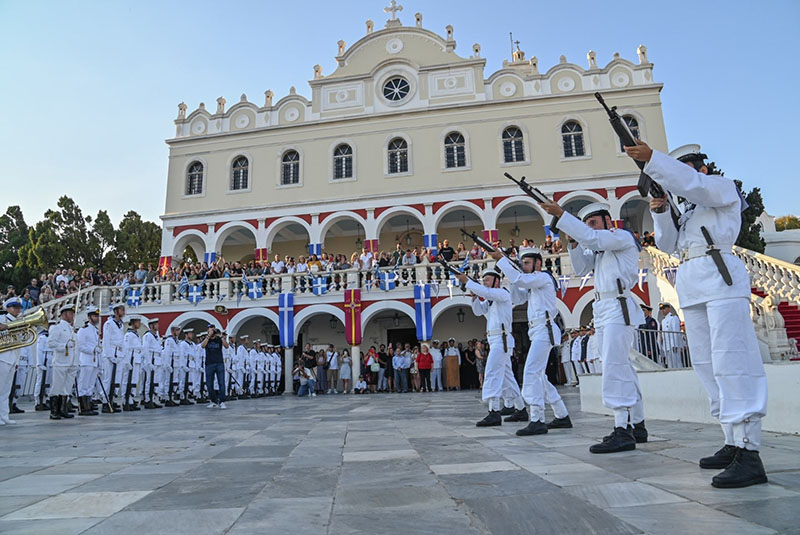 α. Στη νήσο Τήνο παρουσία του Πρωθυπουργού Κυριάκου Μητσοτάκη, του Υπουργού Εθνικής Άμυνας Νίκου Δένδια, του Αρχηγού ΓΕΕΘΑ Στρατηγού Κωνσταντίνου Φλώρου, του Αρχηγού ΓΕΝ Αντιναυάρχου Ιωάννη Δρυμούση ΠΝ και του Αρχηγού Λ.Σ.-ΕΛ.ΑΚΤ. Αντιναυάρχου Λ.Σ. Γεωργίου Αλεξανδράκη, καθώς επίσης και αντιπροσωπειών των Ενόπλων Δυνάμεων, των Σωμάτων Ασφαλείας και των τοπικών αρχών. Την Τρίτη 15 Αυγούστου, ο Πρωθυπουργός Κυριάκος Μητσοτάκης πραγματοποίησε ρίψη στεφάνου εν πλω από το ΤΠΚ ΞΕΝΟΣ, προς τιμή των πεσόντων του καταδρομικού «ΕΛΛΗ», ενώ στο πλαίσιο των ευρύτερων εκδηλώσεων τη Δευτέρα 14 Αυγούστου, ο Αρχηγός ΓΕΝ κατέθεσε στεφάνι στο κενοτάφιο των πεσόντων στο χώρο του Ιερού Ιδρύματος Ευαγγελιστρίας Τήνου. Στο λιμένα Τήνου κατέπλευσαν η Φρεγάτα (Φ/Γ) ΛΗΜΝΟΣ, το Αρματαγωγό (Α/Γ) ΣΑΜΟΣ με το οποίο διεξάγεται η θερινή εκπαίδευση της Σχολής Μονίμων Υπαξιωματικών Ναυτικού (ΣΜΥΝ) και το Ταχύ Περιπολικό Κατευθυνομένων Βλημάτων (ΤΠΚ) ΞΕΝΟΣ.