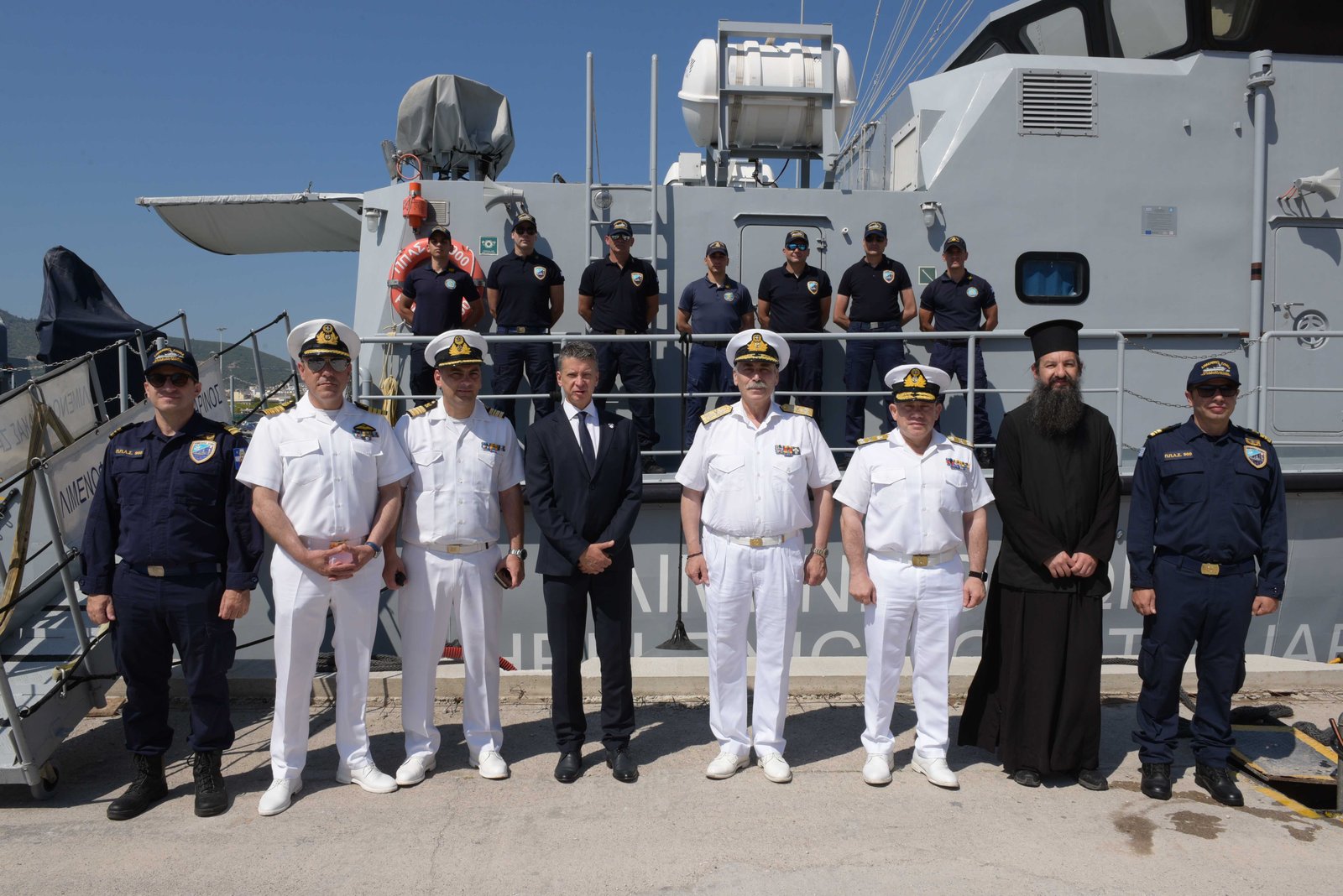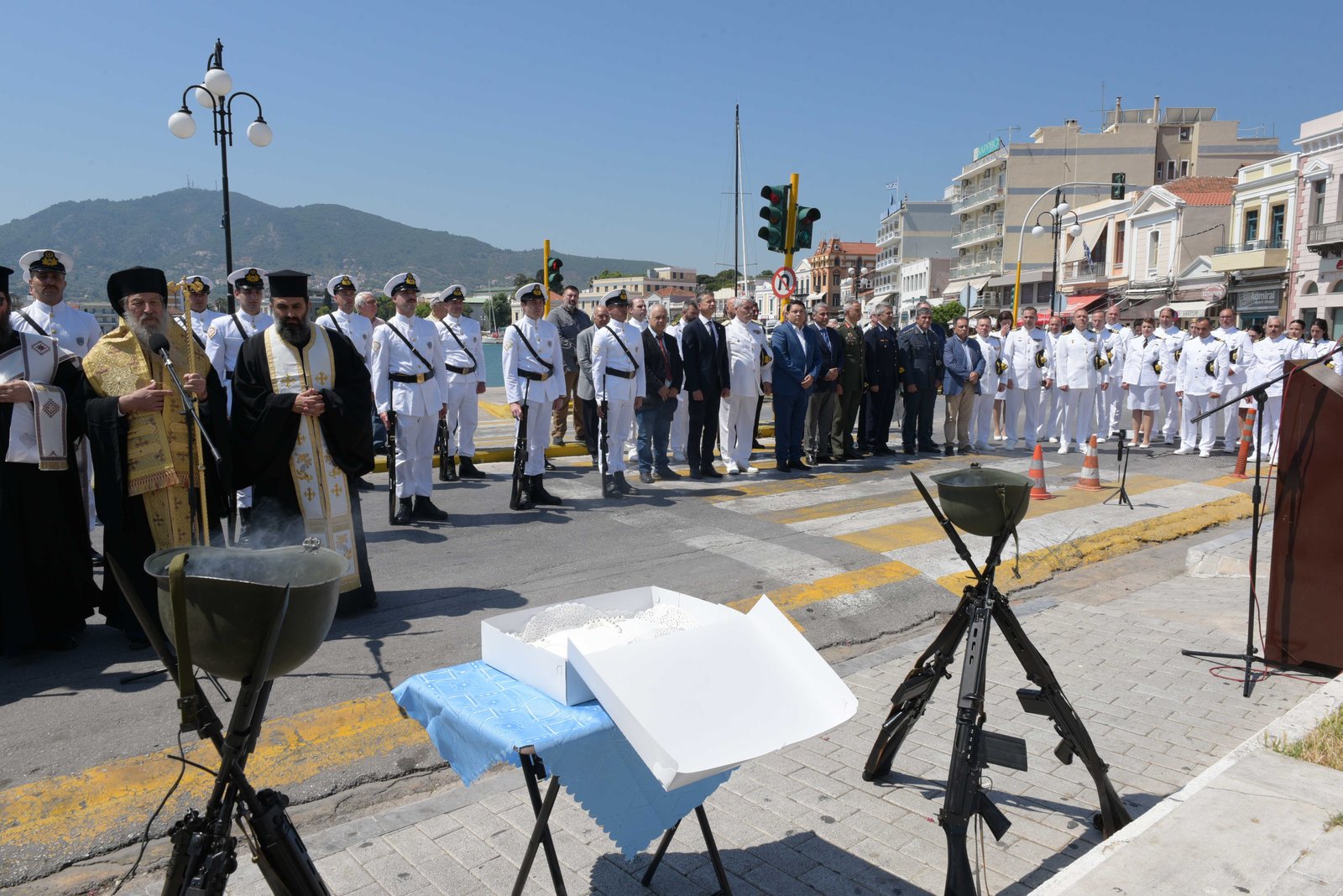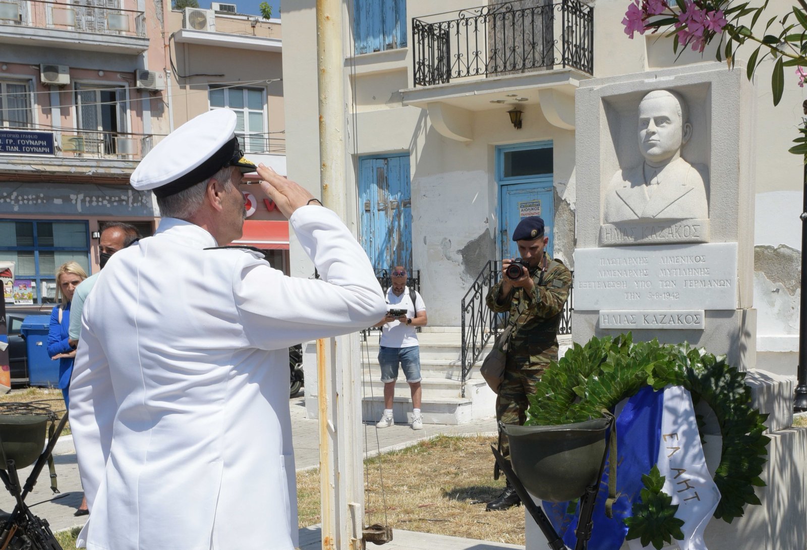 Ακολούθως, ο κ. Υπουργός και ο κ. Αρχηγός παρέστησαν στην επιμνημόσυνη δέηση, χοροστατούντος του Μητροπολίτη Μυτιλήνης, Ερεσσού και Πλωμαρίου κ.κ. Ιακώβου, για τη συμπλήρωση 81 ετών από την εκτέλεση υπό Γερμανικών στρατευμάτων του Πλωτάρχη Λ.Σ. Καζάκου Ηλία, Λιμενάρχη Μυτιλήνης, έμπροσθεν της προτομής του, στον προαύλιο χώρο του παλαιού Λιμεναρχείου.