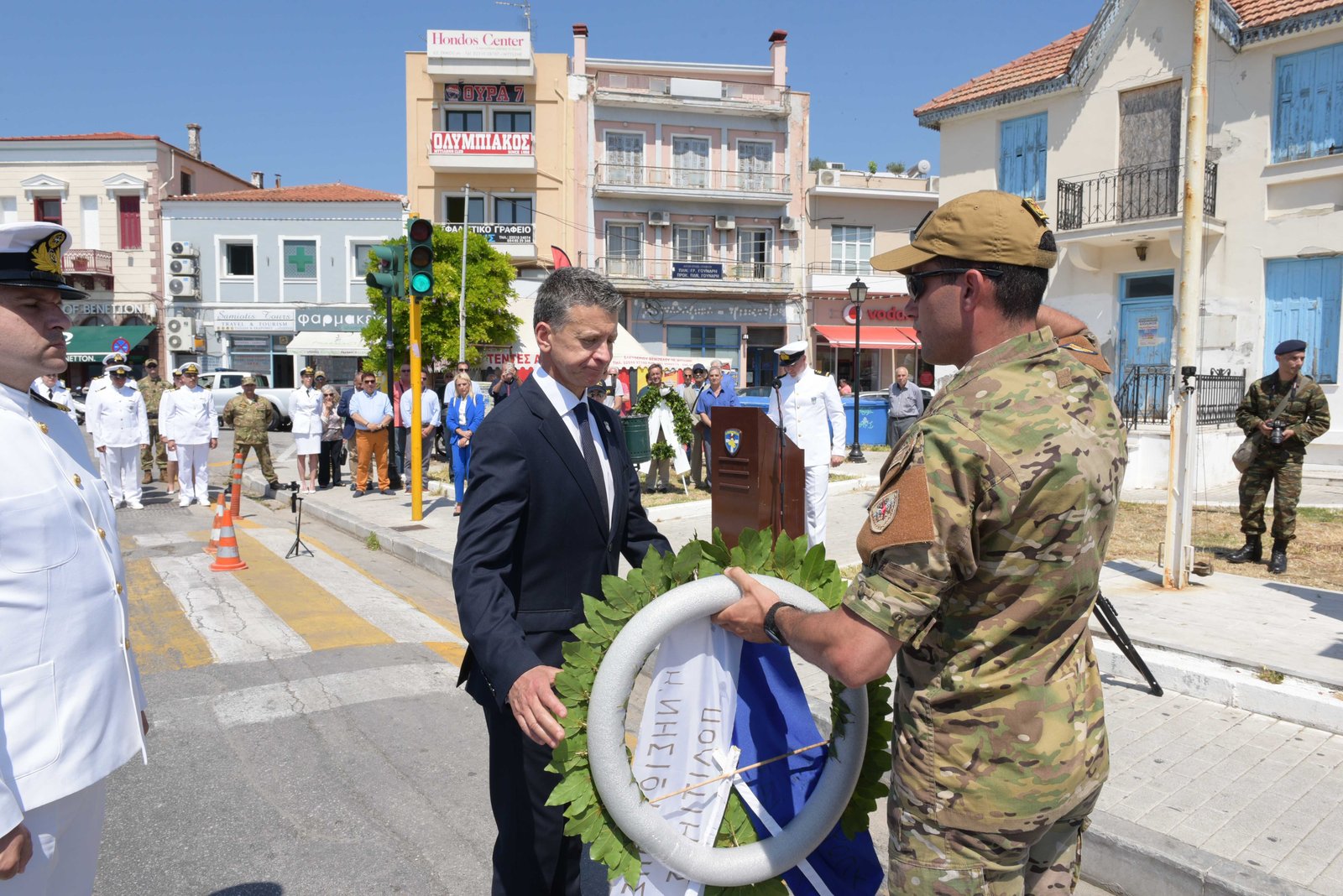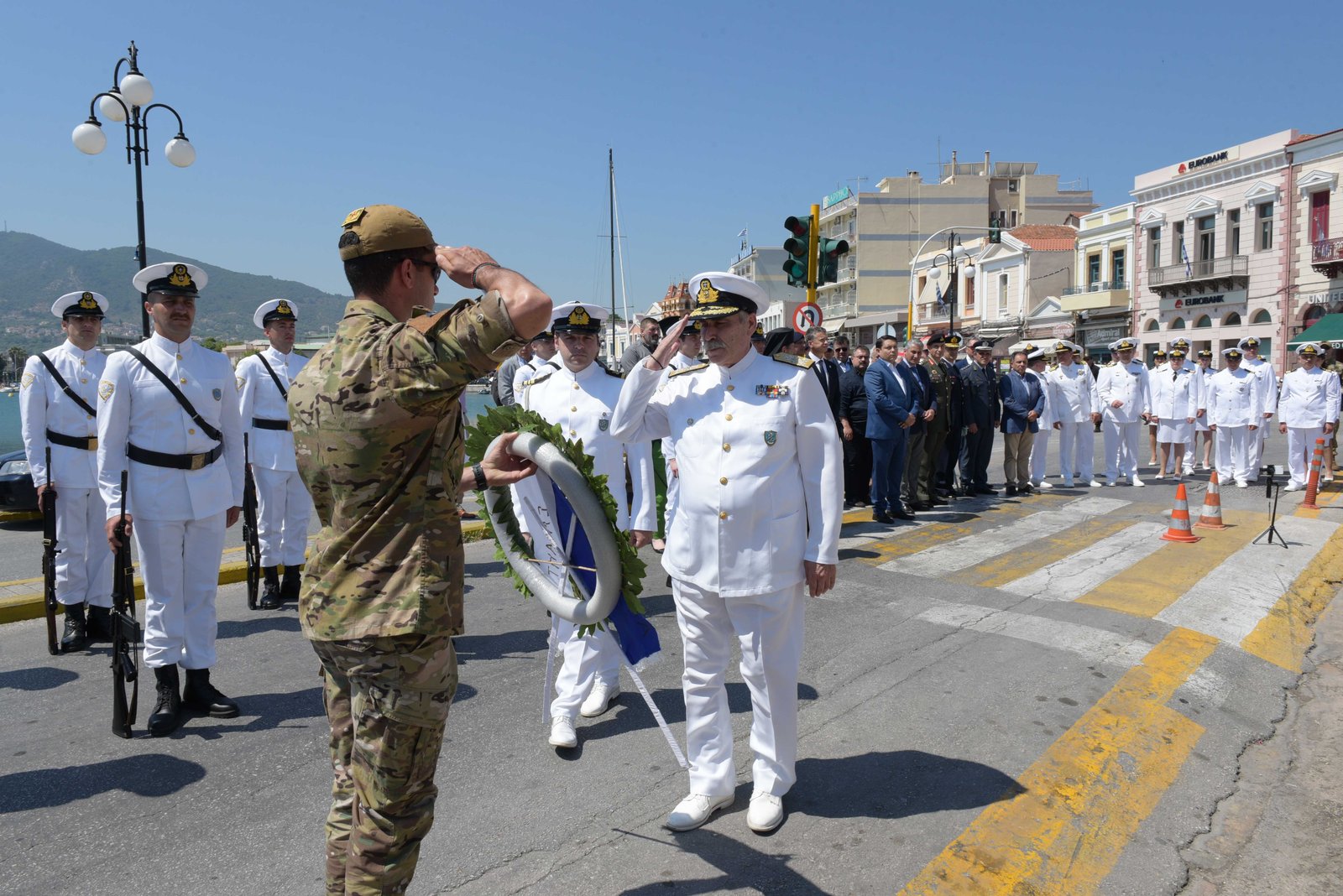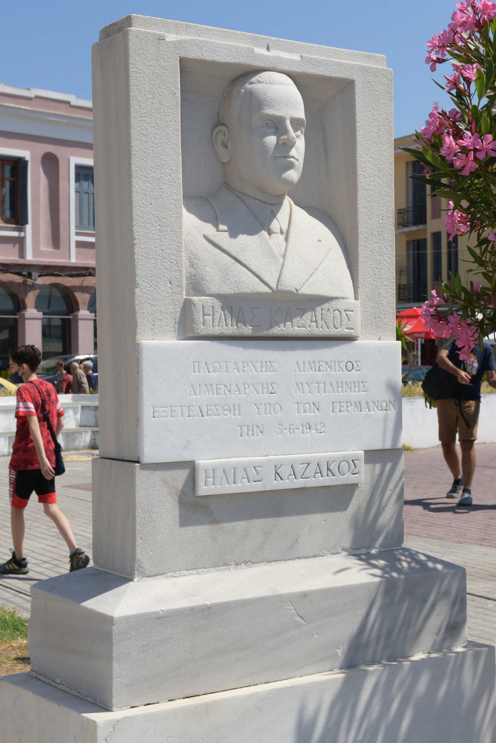 Ακολούθως, ο κ. Υπουργός και ο κ. Αρχηγός παρέστησαν στην επιμνημόσυνη δέηση, χοροστατούντος του Μητροπολίτη Μυτιλήνης, Ερεσσού και Πλωμαρίου κ.κ. Ιακώβου, για τη συμπλήρωση 81 ετών από την εκτέλεση υπό Γερμανικών στρατευμάτων του Πλωτάρχη Λ.Σ. Καζάκου Ηλία, Λιμενάρχη Μυτιλήνης, έμπροσθεν της προτομής του, στον προαύλιο χώρο του παλαιού Λιμεναρχείου.