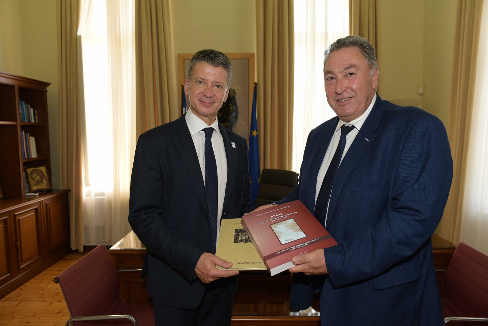 Ο κ. Υπουργός επισκέφθηκε επίσης την έδρα της Γενικής Γραμματείας Αιγαίου και Νησιωτικής Πολιτικής όπου συναντήθηκε με τον Γενικό Διευθυντή, κ. Βουγιούκα – Μιχαλακέλη Παύλο, τους Διευθυντές των Διευθύνσεων της Γενικής Γραμματείας, καθώς και τον πρόεδρο και το Δ.Σ. του συλλόγου των εργαζομένων της υπηρεσίας.