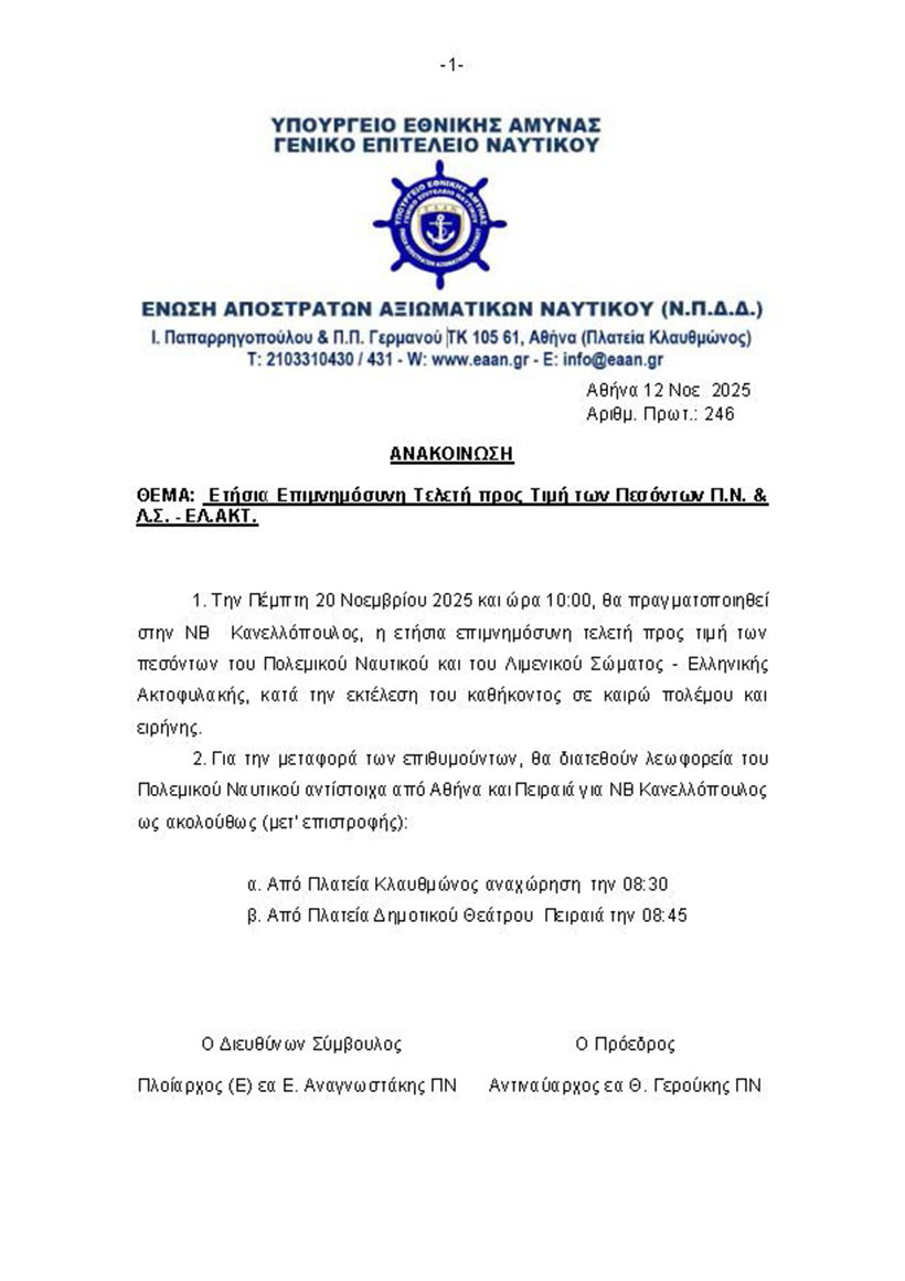 Ετήσιο Μνημόσυνο προς Τιμή των Πεσόντων ΠΝ & ΛΣ-ΕΛ.ΑΚΤ στη ΝΒ Κανελλόπουλος Νοέ 14, 2025 Share on FacebookPost on XFollow usSave