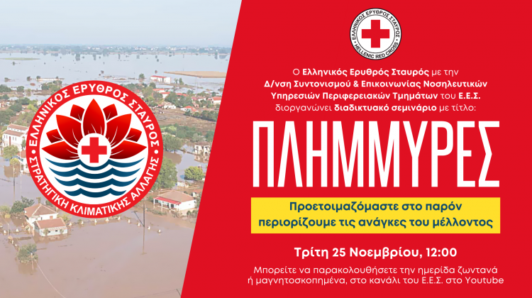 Ο Ελληνικός Ερυθρός Σταυρός (Ε.Ε.Σ.), στο πλαίσιο υλοποίησης της Στρατηγικής Κλιματικής Αλλαγής του Ε.Ε.Σ., διοργανώνει σήμερα Τρίτη 25 Νοεμβρίου 2025 και ώρα 12:00 μ.μ. διαδικτυακό σεμινάριο με θέμα: «Πλημμύρες: Προετοιμαζόμαστε στο παρόν, περιορίζουμε τις ανάγκες του μέλλοντος». Το διαδικτυακό σεμινάριο θα τιμήσει με την παρουσία του ο Πρόεδρος του Ε.Ε.Σ., Dr. Αντώνιος Αυγερινός.