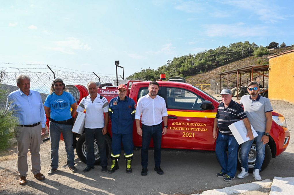 Ο Υφυπουργός Εθνικής Άμυνας, στο πλαίσιο της επίσκεψής του στο ΕΦ «Οινουσσών», παρέδωσε μέσα προστασίας σε εθελοντές πυροσβέστες της ομώνυμης νήσου, παρουσία του Δημάρχου κ. Γεώργιου Δανιήλ, ενώ με πρωτοβουλία του κ. Χαρδαλιά αντίστοιχο υλικό έχει δρομολογηθεί να παραδοθεί σε εθελοντές πυροσβέστες στα Ψαρά, στους Φούρνους και στον Άγιο Ευστράτιο. Η δωρεά του Υπουργείου Εθνικής Άμυνας αποσκοπεί στη διαχρονική υποστήριξη με υλικά μέσα του σημαντικού εθελοντικού έργου που επιτελούν οι εθελοντές πυροσβέστες, με την ενεργή συμμετοχή τους στα σχέδια πυροπροστασίας και πυρόσβεσης σε όλη την ελληνική επικράτεια.