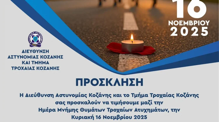 Η Διεύθυνση Αστυνομίας Κοζάνης και το Τμήμα Τροχαίας Κοζάνης, με αφορμή την «Παγκόσμια Ημέρα Μνήμης για τα Θύματα Τροχαίων Ατυχημάτων», θα πραγματοποιήσουν Δρόμο Μνήμης τιμώντας τη μνήμη όσων έχασαν την ζωή τους από Τροχαία ατυχήματα, ενώ θα ακολουθήσει εκδήλωση στην Στέγη Ποντιακού Πολιτισμού στην πόλη της Κοζάνης, με τίτλο «Δρόμοι Ασφαλείς για όλους».