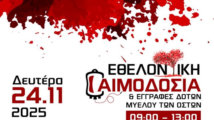Τη Δευτέρα 24 Νοεμβρίου 2025, από τις 9 το πρωϊ έως τη μία ο μεσημέρι, θα διενεργηθεί εθελοντική αιμοδοσία και εγγραφές δοτών μυελού των οστών. Η δράση θα πραγματοποιηθεί σε συνεργασία με το Σύλλογο Εθελοντών Αιμοδοτών Ν. Ρεθύμνου «Δότες Ζωής», στο χώρο του Συμβουλευτικού Κέντρου Γυναικών (οδός Δημακοπούλου 18,Τηλ: 2831056607).