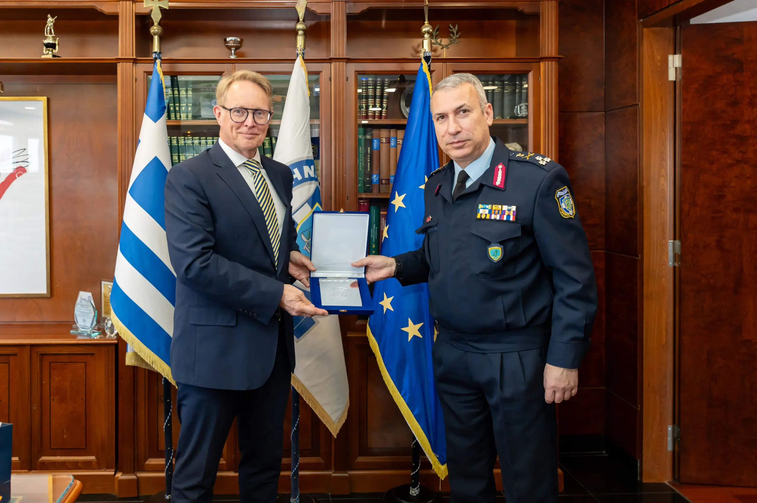 Η ενίσχυση της ήδη στενής συνεργασίας για την προστασία των εξωτερικών συνόρων της Ευρωπαϊκής Ένωσης, επιβεβαιώθηκε για άλλη μια φορά στη νέα συνάντηση που είχε ο Υπουργός Προστασίας του Πολίτη, Μιχάλης Χρυσοχοΐδης με τον Εκτελεστικό Διευθυντή του Frontex, Χανς Λέιτενς (Hans Leijtens), παρουσία του Γενικού Γραμματέα Δημόσιας Τάξης, Παναγιώτη Στάθη και του Αρχηγού της ΕΛ.ΑΣ, Αντιστρατήγου Δημητρίου Μάλλιου .