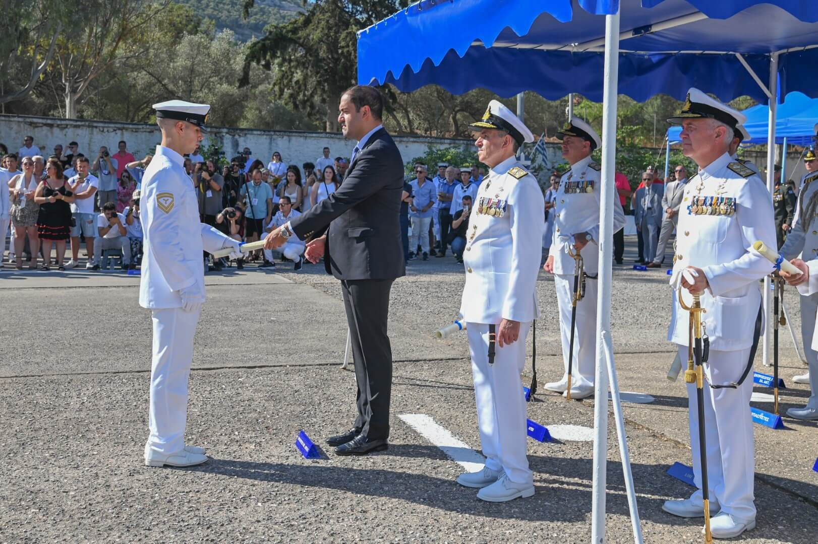 Τα πτυχία αποφοίτησης επέδωσε ο Υφυπουργός Εθνικής Άμυνας κ. Ιωάννης Κεφαλογιάννης παρουσία του Αρχηγού ΓΕΝ Αντιναύαρχου Ιωάννη Δρυμούση ΠΝ. Επιπλέον στην τελετή παρέστησαν ο Αρχηγός Στόλου Αντιναύαρχος Δημήτριος-Ελευθέριος Κατάρας ΠΝ, ο Διοικητής Διοίκησης Ναυτικής Εκπαίδευσης (ΔΝΕ) Υποναύαρχος Πολυχρόνης Κουλούρης ΠN, o Αρχιεπιστολέας ΓΕΝ Υποναύαρχος Γεώργιος Φλώρος ΠΝ, ο Γενικός Επιθεωρητής ΠΝ Υποναύαρχος (Μ) Παναγιώτης Δημητρόγλου ΠΝ, εκπρόσωποι των Αρχηγών των Γενικών Επιτελείων, των Σωμάτων Ασφαλείας, του Γενικού Επιτελείου της Εθνικής Φρουράς, εκπρόσωποι των κομμάτων καθώς και συγγενείς και φίλοι των νέων Κελευστών.