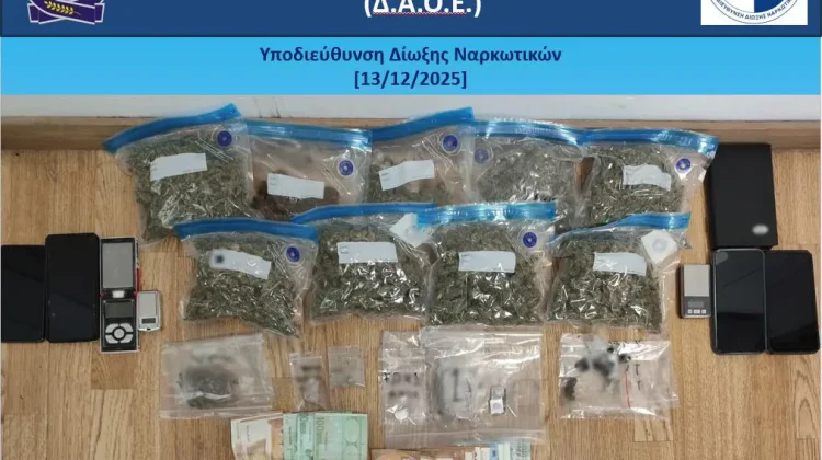 Κατασχέθηκαν, μεταξύ άλλων, 103,5 γραμμάρια ηρωίνης, 870 γραμμάρια ακατέργαστης κάνναβης, καθώς και το χρηματικό ποσό των 1.825 ευρώ