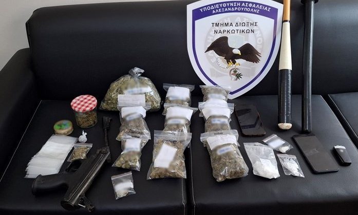 Ακολούθως, σε έρευνα που πραγματοποιήθηκε από αστυνομικούς του Τμήματος Δίωξης Ναρκωτικών της Υποδιεύθυνσης Δίωξης και Εξιχνίασης Εγκλημάτων Αλεξανδρούπολης στις οικίες των δύο συλληφθέντων με τη συνδρομή του αστυνομικού σκύλου ανίχνευσης ναρκωτικών “LAIKA” βρέθηκαν συνολικά και κατασχέθηκαν δύο συσκευασίες και ένα βάζο με ποσότητα ακατέργαστης κάνναβης συνολικού βάρους  13 γραμμαρίων, μικροποσότητα κοκαΐνης, μικροποσότητα ακατέργαστης κάνναβης αναμεμειγμένης με καπνό,  1 πλαστικός τρίφτης,  32 κενές νάιλον συσκευασίες,  1 αεροβόλο πιστόλι, 1 γκλοπ και 1 ξύλινο ρόπαλο. Κατασχέθηκε επίσης το όχημα που χρησιμοποίησαν οι δράστες.