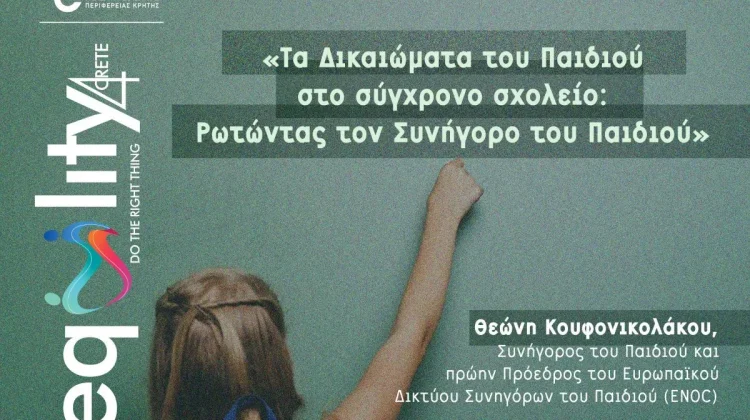 Στο πλαίσιο της Εκστρατείας της Περιφέρειας Κρήτης, Αυτοτελούς Γραφείου Ισότητας, «Equality4Crete – Do the Right Thing», διοργανώνεται ενημερωτική εκδήλωση με στόχο την ανάδειξη των δικαιωμάτων του παιδιού στη σύγχρονη εκπαιδευτική πραγματικότητα, την Τρίτη, 14 Οκτωβρίου 2025, 6:00-8:00μ.μ., στο Πολύκεντρο του Δήμου Ηρακλείου (Οδός Ανδρόγεω 4).